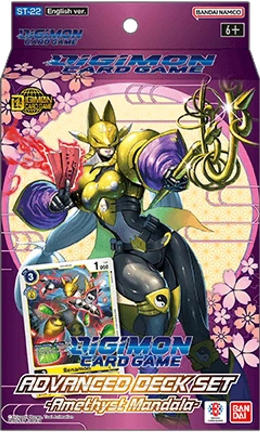 Amethyst Mandala [ST22] includes new cards for Renamon, Kyubimon, and Taomon, as well as a Sakyamon ACE! There's also a card for Sakuyamon's special move "Amethyst Mandala" and new Plug-in theme Option cards power it up beyond any previous Renamon decks!